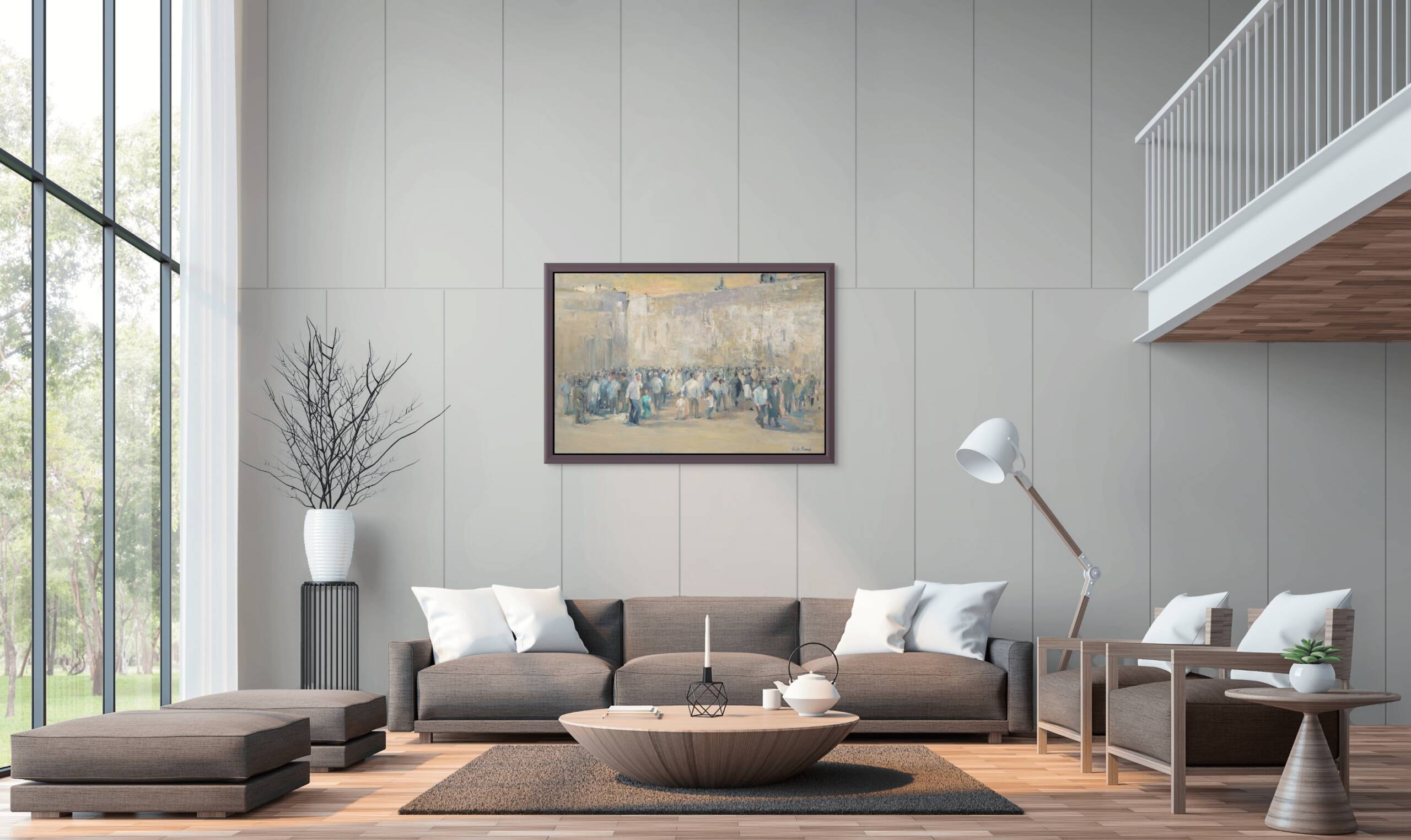 This painting portrays a gathering of men and boys at the Kotel, bound together in prayer and tradition. The scene is tender and timeless, fathers guiding sons, elders passing on the rhythms of devotion, and children absorbing the sacred atmosphere of Jerusalem’s holiest site. It is a sweet reminder that heritage is not only preserved in stone, but in the hands, hearts, and voices of each new generation.
