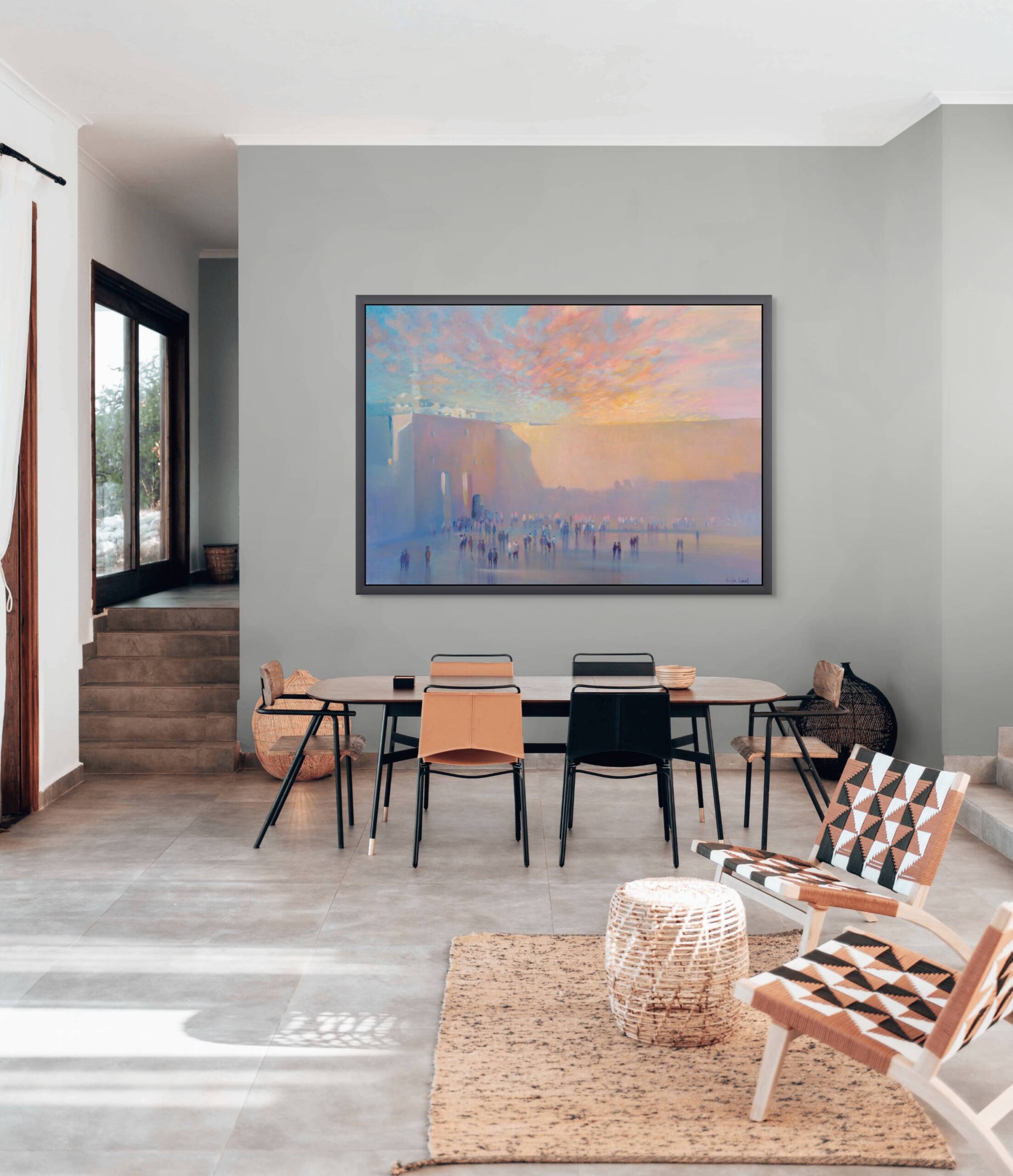 This painting captures the Kotel bathed in the soft glow of dawn, when the sky awakens in a symphony of pinks and blues. As the sun begins to rise from behind the holy site, the ancient stones seem to breathe with the colors of heaven. It is a fleeting, sacred moment. An explosion of light and beauty before the sky settles into the calm blue of day. In this stillness, Jerusalem feels eternal, suspended between night and day, earth and heaven, prayer and promise.
