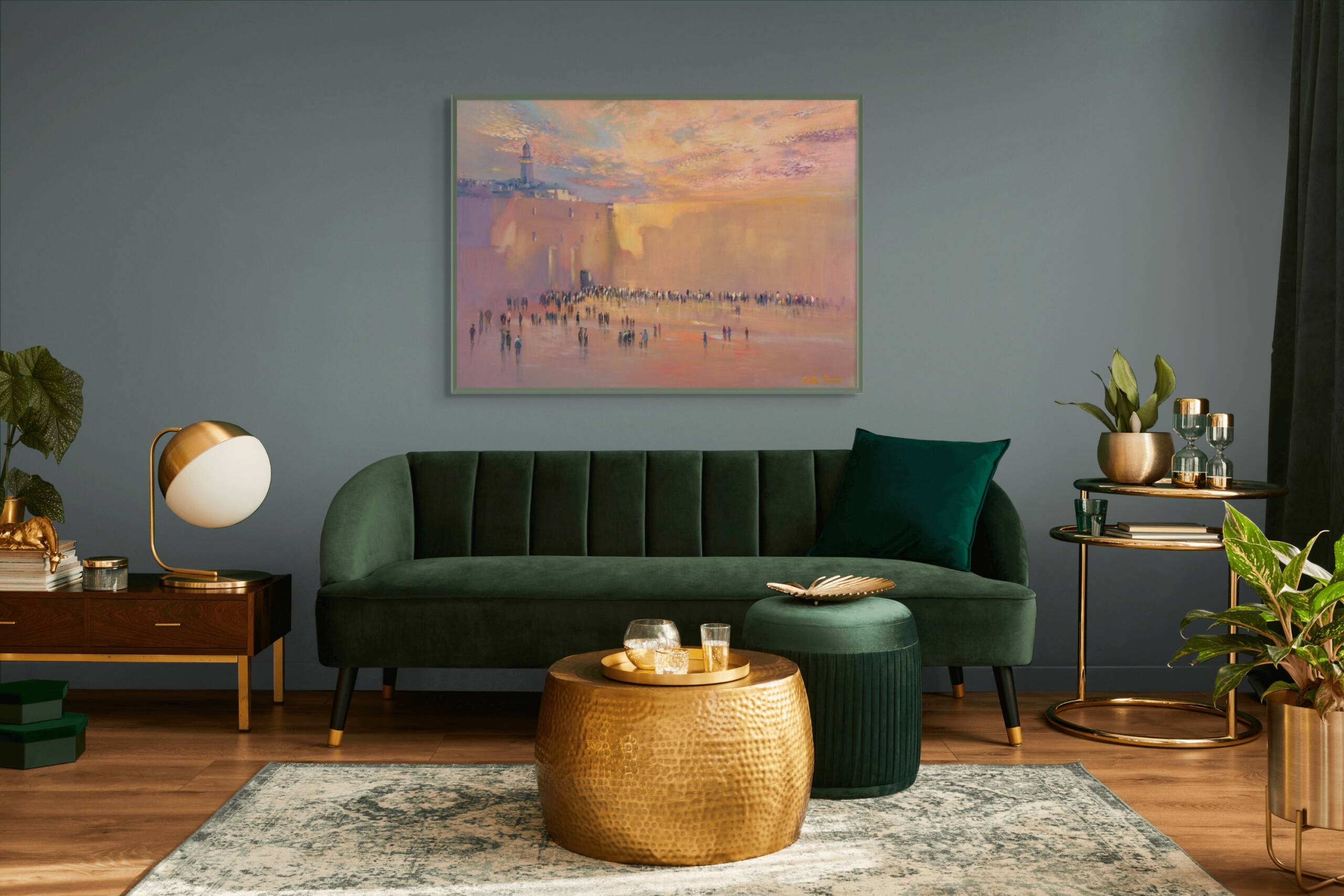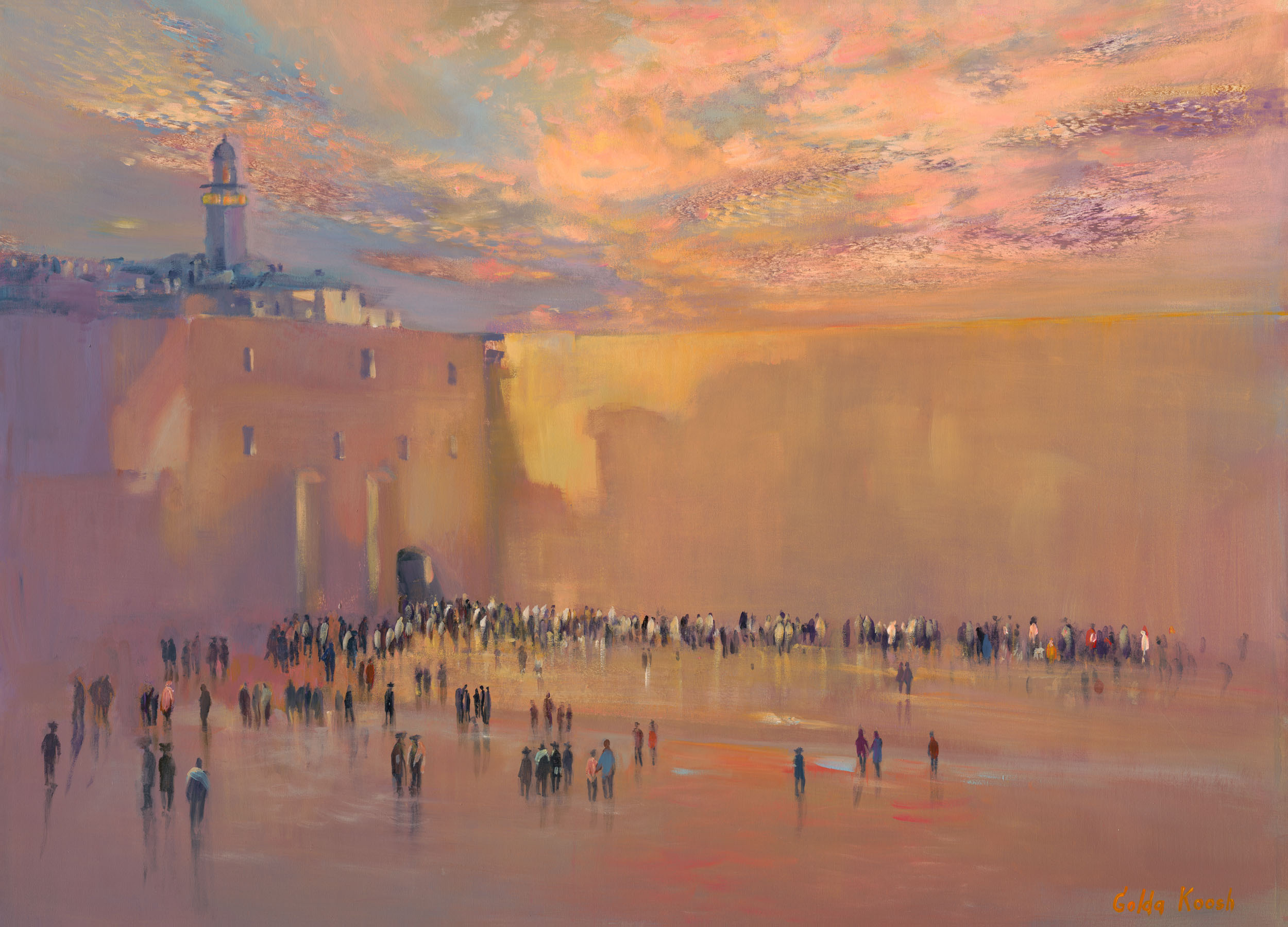 Bathed in warm gold and copper tones, this painting radiates a quiet softness. The gentle palette carries a sense of stillness, as if time has slowed to honor the Kotel’s presence. Light seems to rest upon the surface, creating a glow that is both intimate and serene.