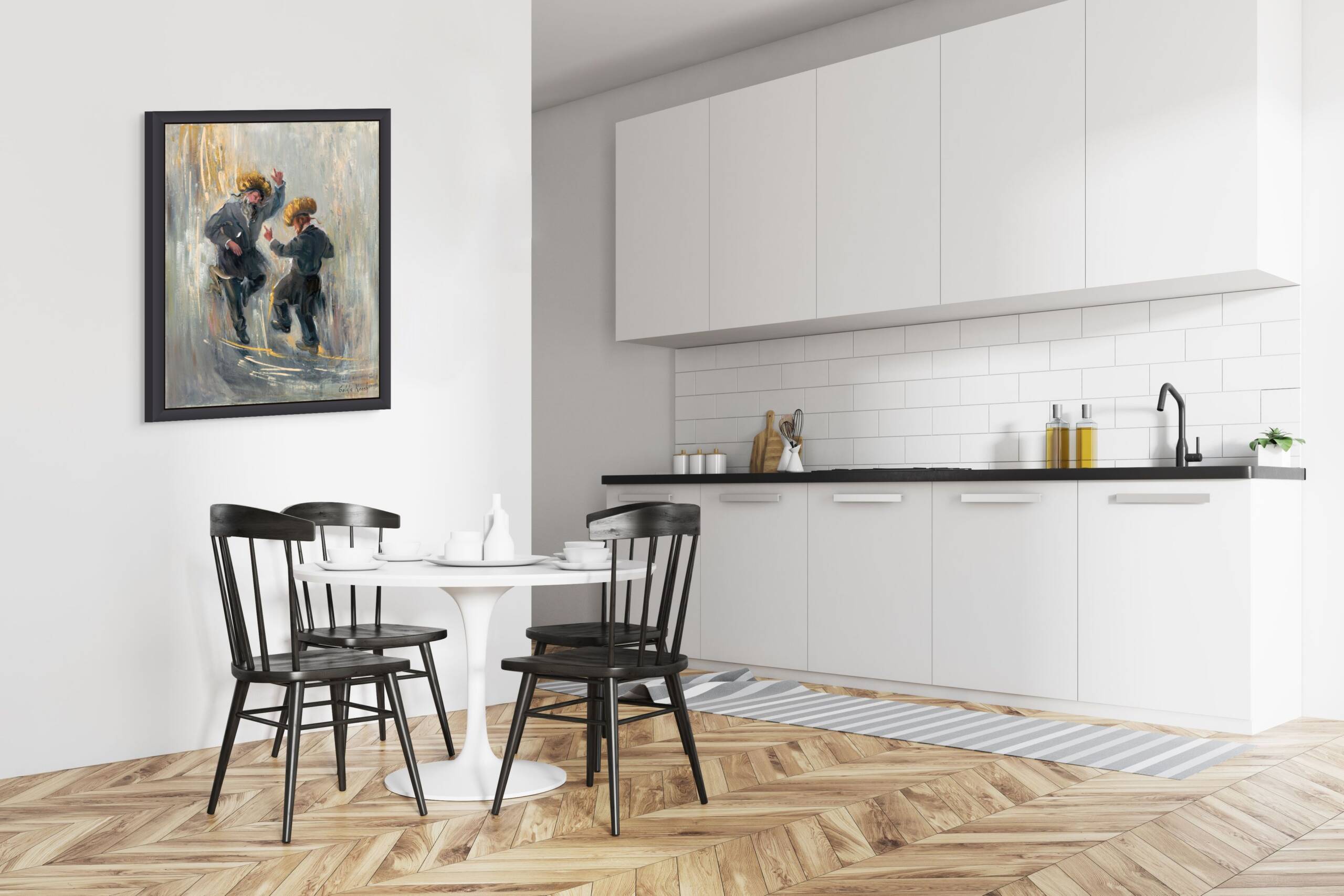 This painting captures the joyous movement of two men, dressed in traditional shtreimels, dancing to the lively rhythms of klezmer music. Golden swirls flow around them, echoing the energy and celebration of the moment, as if the music itself has taken visible form. The composition conveys both the physical exuberance of the dance and the spiritual uplift it brings, celebrating community, tradition, and the timeless joy of Jewish cultural expression.