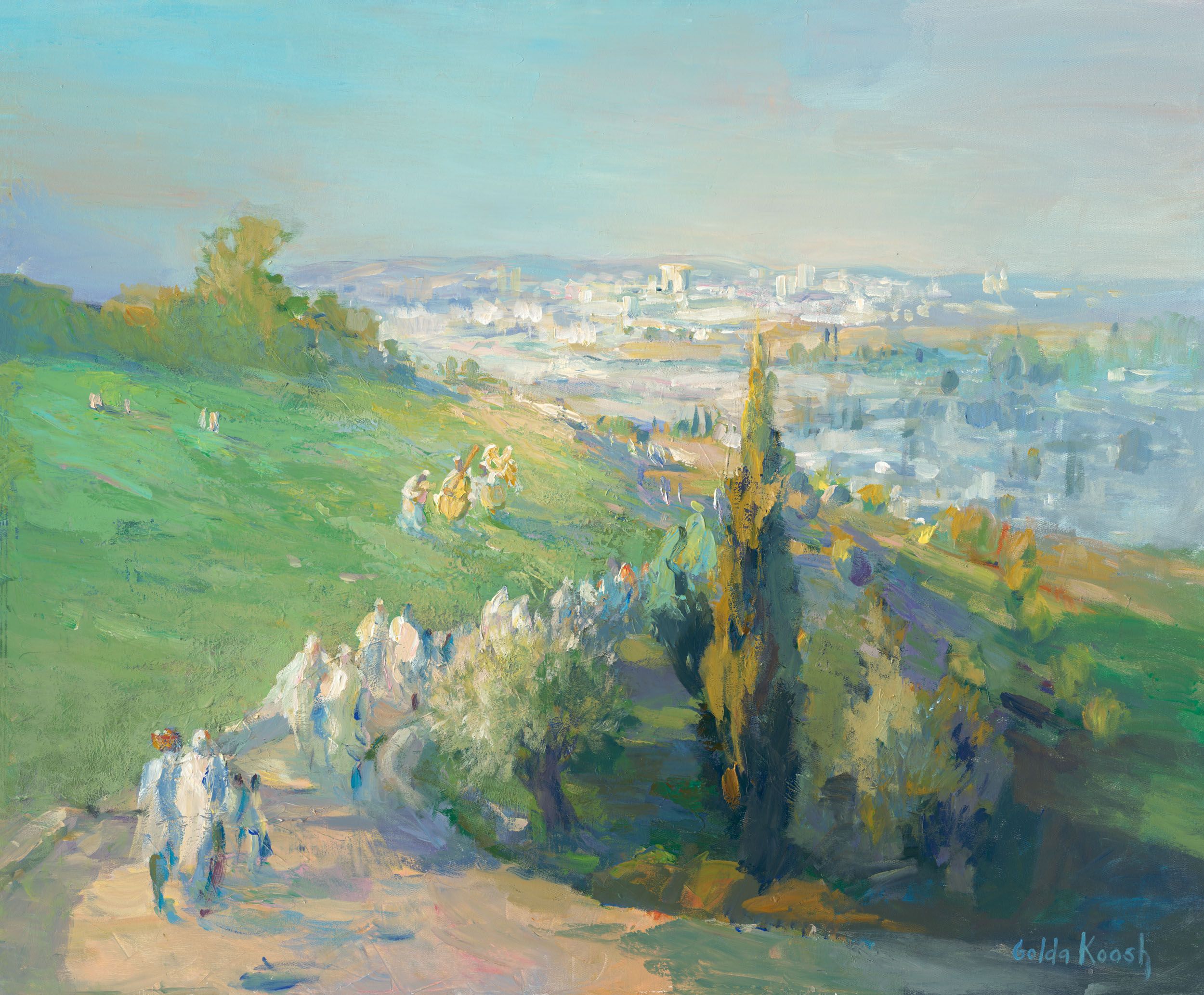 This painting invites the viewer on a journey through rolling green hills toward the heart of history. In the foreground, a cypress tree and soft bushes frame a winding footpath where people make their way toward the city. At first, the city in the distance appears gentle and undefined, but as you look closer, the details emerge unmistakably. Ancient Jerusalem rises before you, and at its center, the Beit HaMikdash stands tall, a beacon calling all toward it. The composition captures both the serenity of the natural landscape and the spiritual pull of the sacred city, guiding the eye and the imagination toward faith, devotion, and the timeless center of Jewish life.
