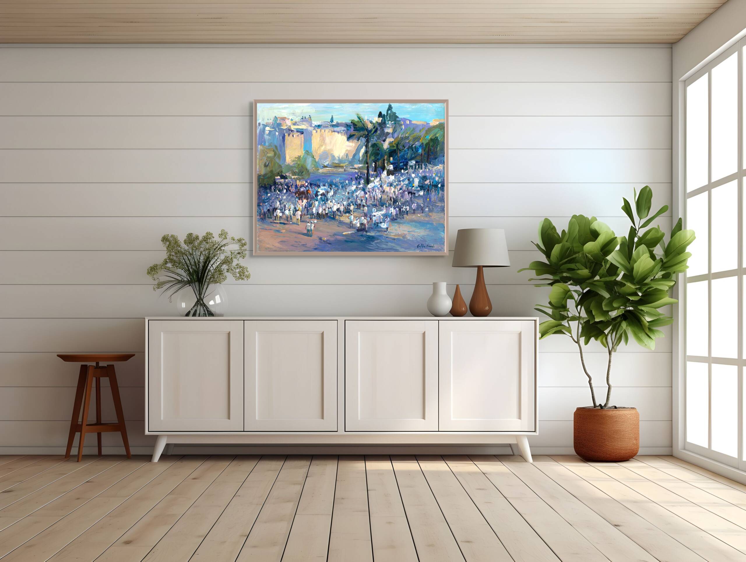 This vibrant painting captures the energy and jubilation of the annual Yom Yerushalayim Flag Parade, celebrating the reunification of Jerusalem. Swirling flags and marching figures fill the streets, conveying both movement and pride. The city itself rises around the parade, a living backdrop to the joy, devotion, and collective spirit of the participants. Through bold colors and dynamic composition, the work evokes the celebration of history, identity, and the enduring connection of the Jewish people to their sacred city. It is a moment of communal pride, unity, and the continuing story of Jerusalem.